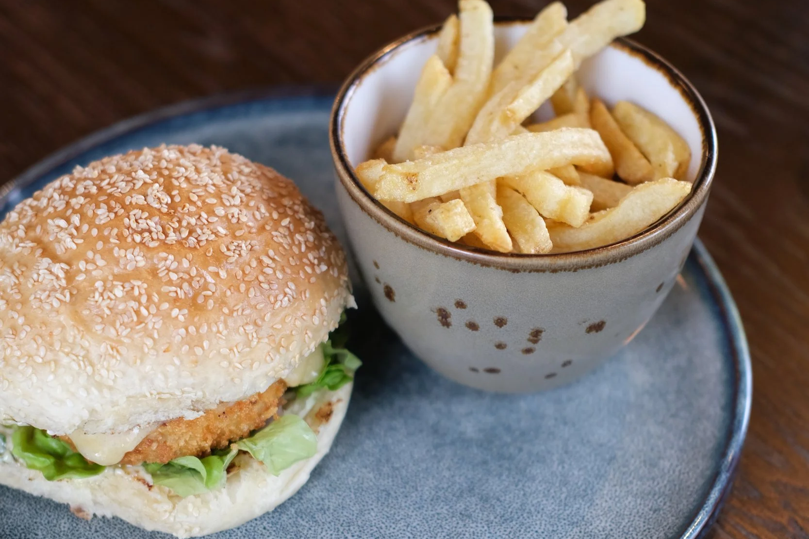 *Burger du moment : pain burger graines de sésame, crème à l’ail, boeuf haché, tomme d’Auvergne, bacon, salade & mayonnaise au paprika fumé.
