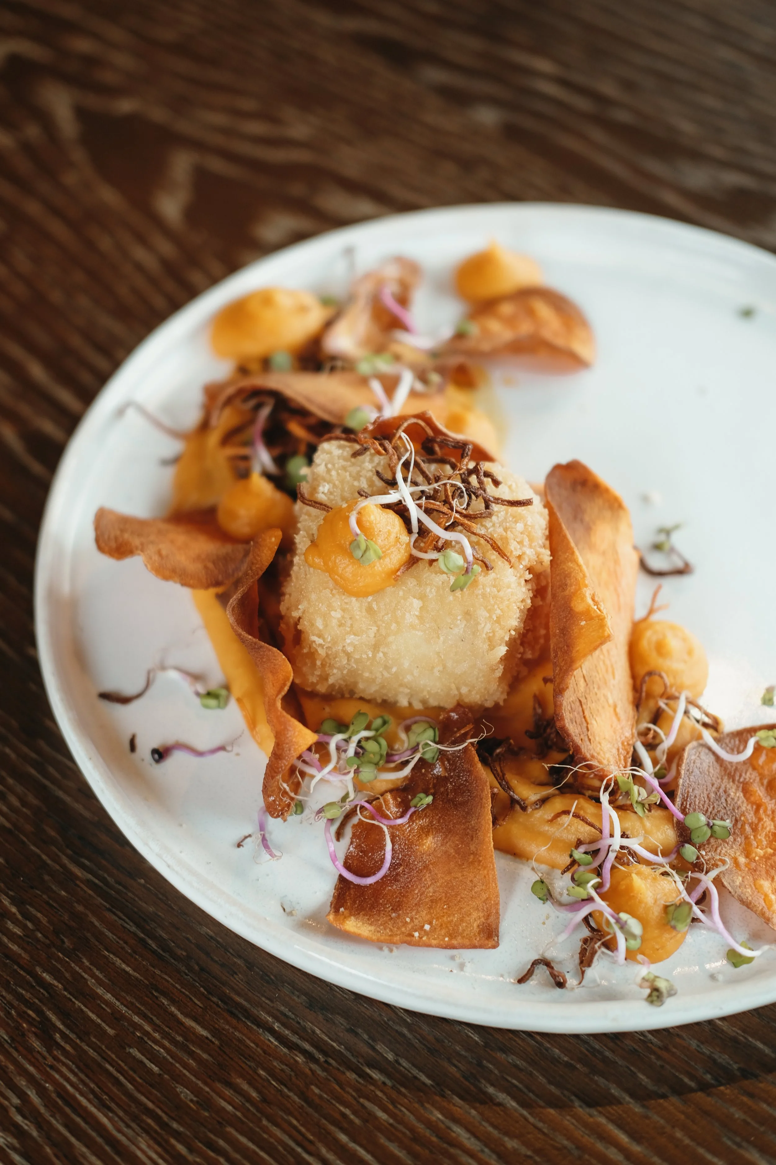 *Gaufre de pommes de terre, espuma de poireaux, mayonnaise d’épinards & pralin aux pignons de pin.
